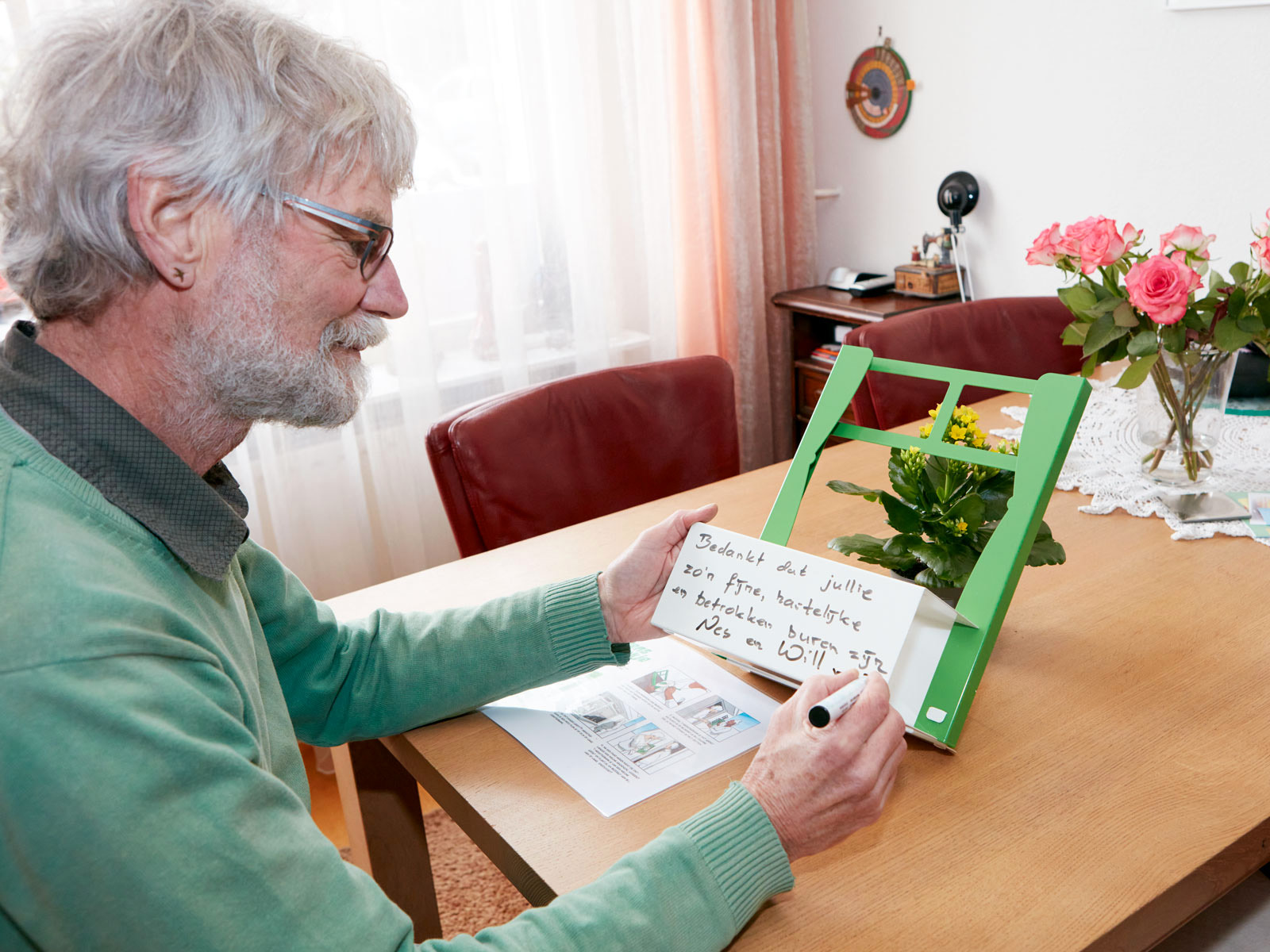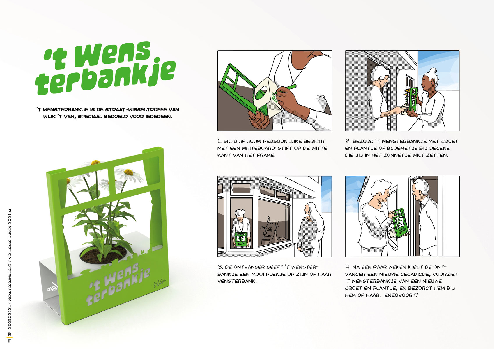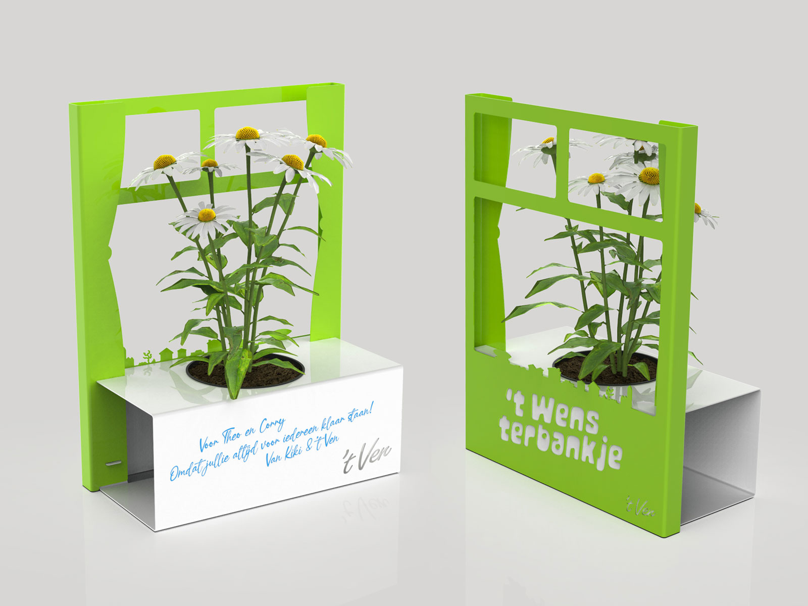 't Wensterbankje is a steel frame in the style of the district magazine in which a plant can be placed and which can be provided with a personal wish on one side. It is placed visibly in front of the window. Recipients provide the frame with a new wish after a few weeks and pass it on to a street companion.